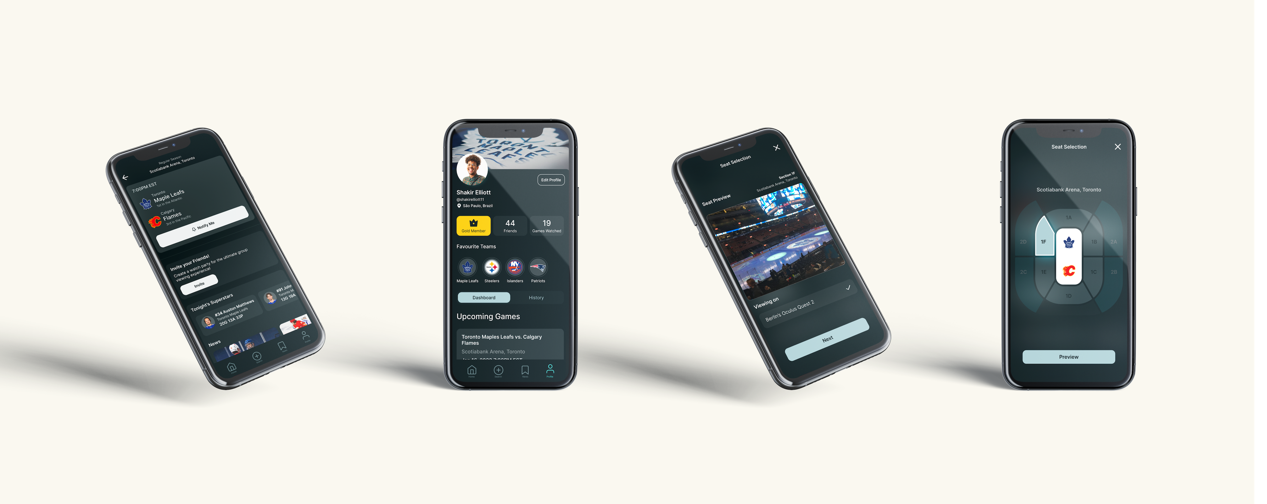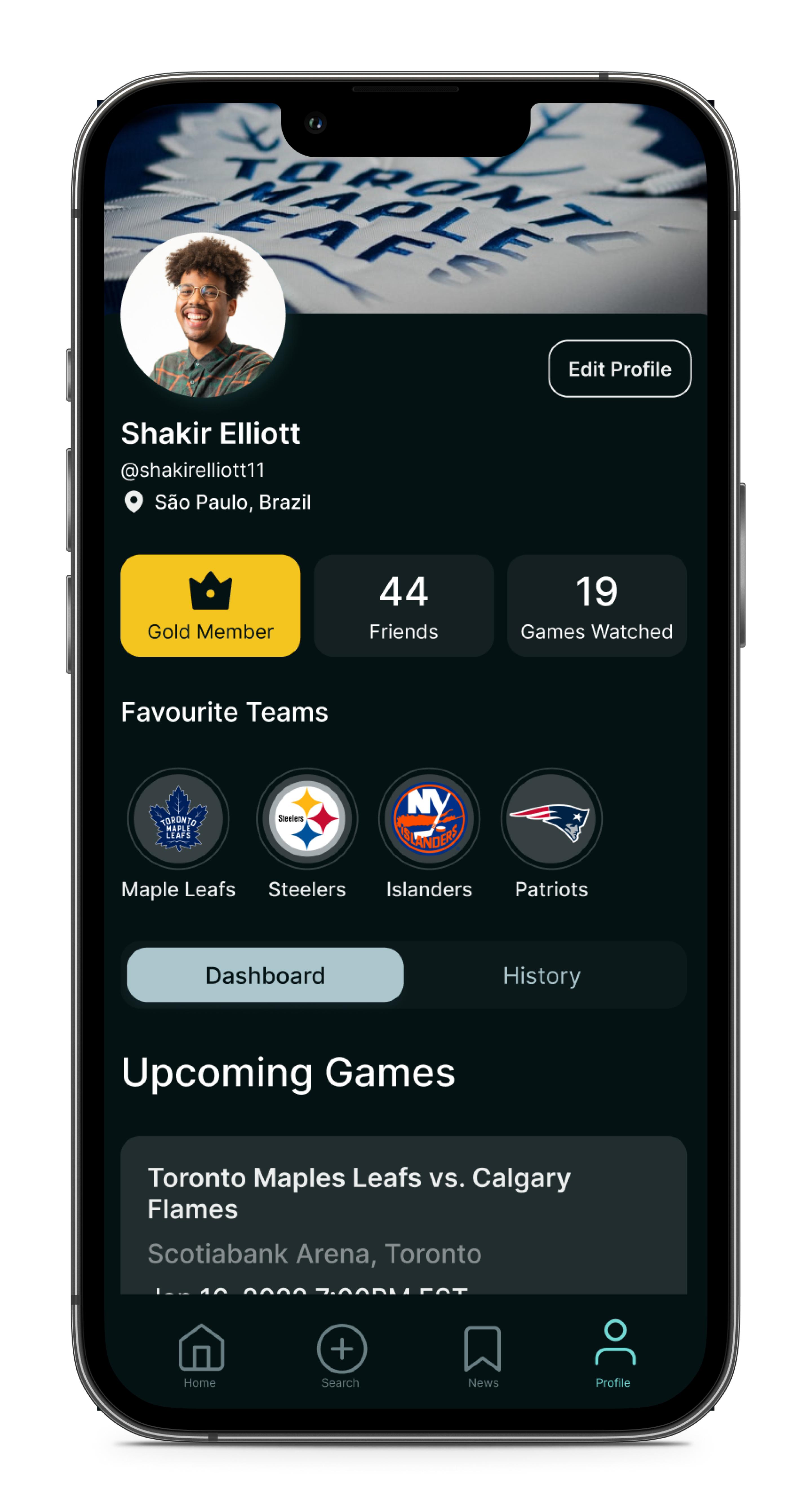 Courtside’s user profiles feature their membership status, number of games watched, and favourite teams. The profile also displays upcoming games through the game dashboard and past games watched